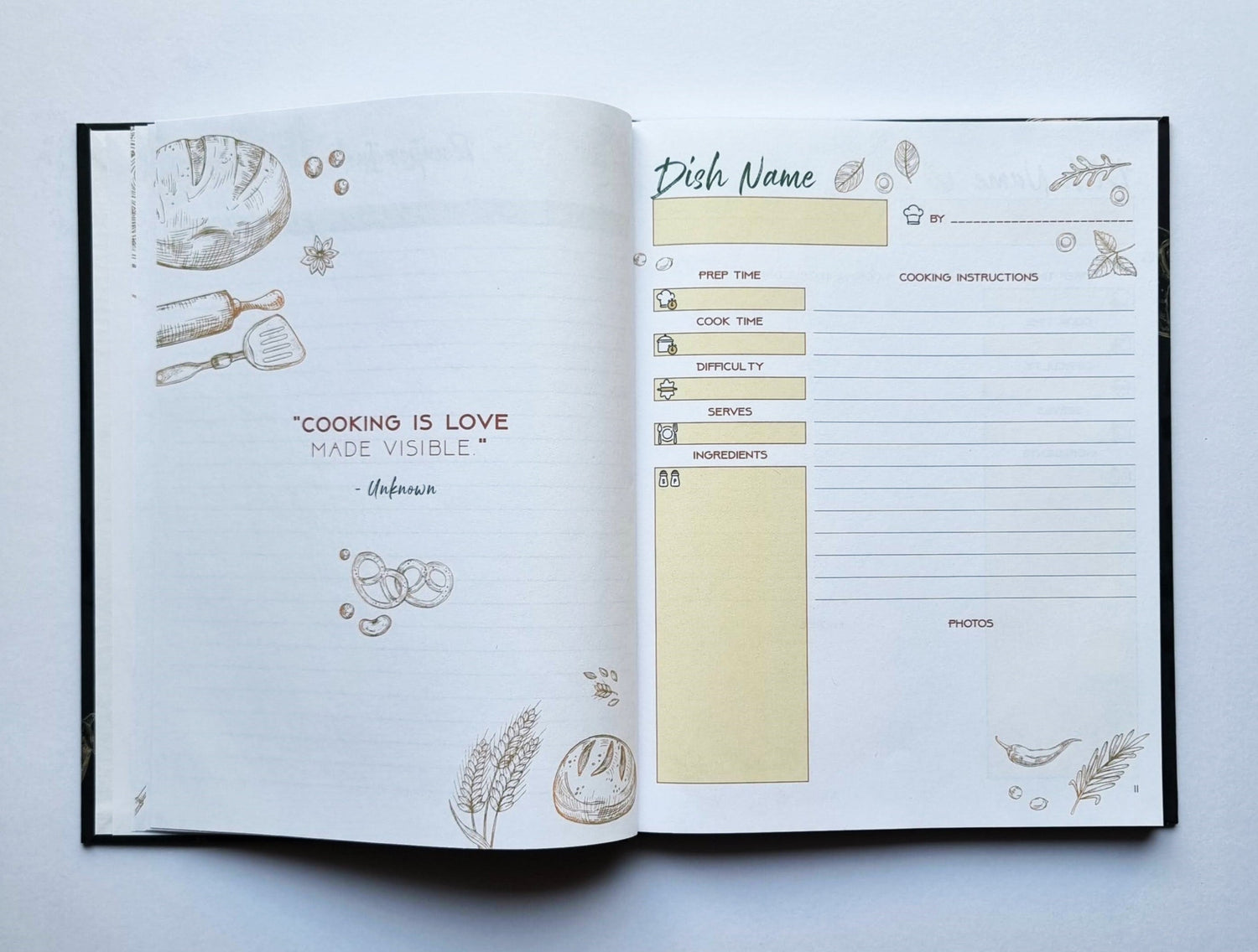 The book has been designed by a UK designer. It has been done so tastefully that you will love creating your own Recipes book.